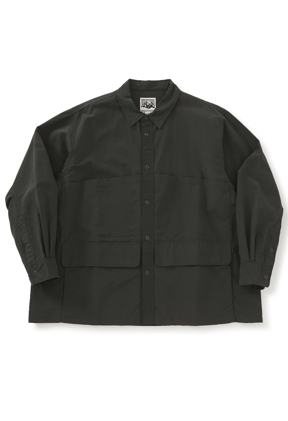 エアバッグに採用されるほどの強度と高い耐久性のあるナイロン糸を使用して織り上げた、防風性、通気性、撥水性、速乾性に優れた高密度ナイロン素材「WINDSHED」を使用したフィールドシャツです。こちらはハイスタンダード別注のアイテムになります。2種類のポケットをフロントに配置したシャツジャケット。短めの着丈で身幅とアームはゆったりと着れるように作りました。インナーにパーカを着た時に収まりが良いように首元のスナップ位置を調整しています。
