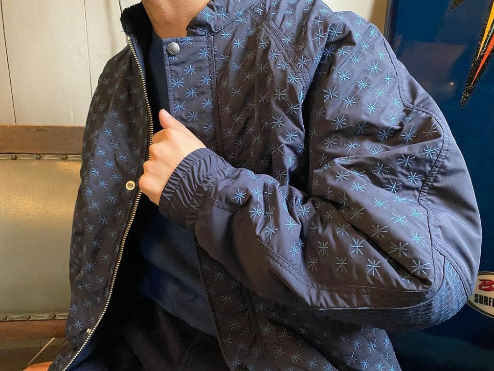 伝統的な刺し子柄でもある米柄とハンドステッチのような柄の二柄をつくりました。ナイロンに刺しゅうという意外な組み合わせが面白い素材です。衿の裏側にはアルパカ混のボアを使用しています。 - ¥165,000(税込)