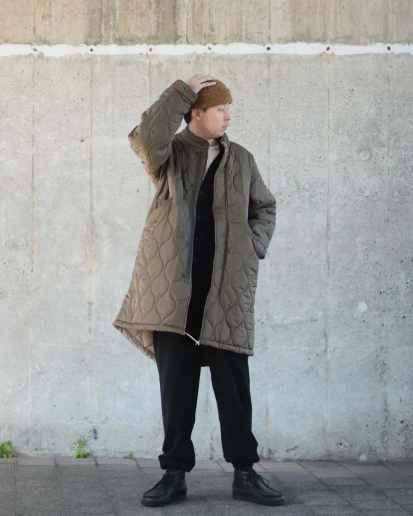 - アメリカ軍のM-65フィッシュテールパーカをモチーフにして、キルティング生地で作りました。しなやかで軽量のリップストップナイロンを用いた、表と裏で色を変えた両面キルト生地。中綿もソフトなものにし、デザイン面と軽さを兼ね備えています。